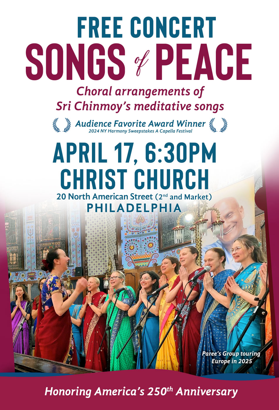 You are warmly invited to “Songs of Peace”, a free concert of soul-stirring music that will fill your heart with peace and hope. An award-winning international women’s choir, Paree’s Group, will perform meditative and joyful a capella arrangements of songs by Sri Chinmoy.  The concert will be held on Friday, April 17, 2026 from 6:30 to 8:00 pm at historic Christ Church, 20 North American Street (2nd and Market).  Reservations are encouraged – please  text 215-383-3663.
